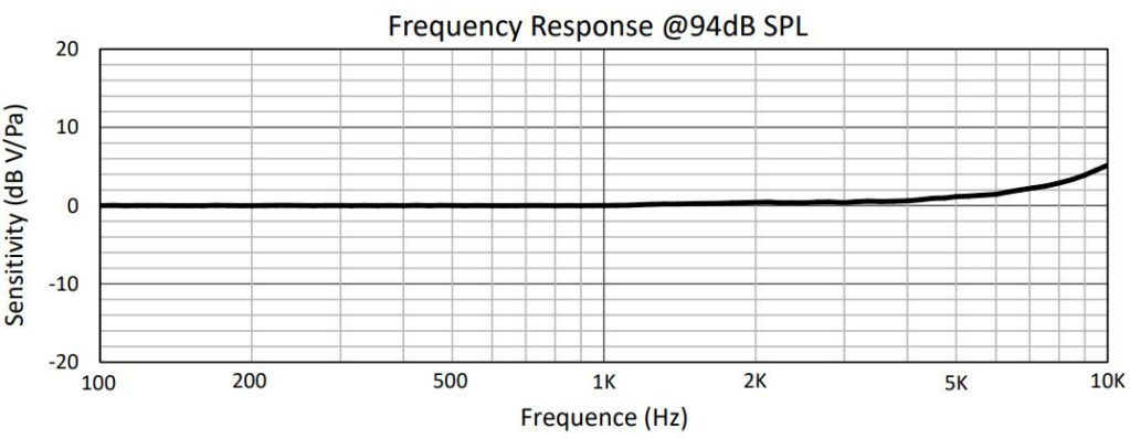 Sensitivity: -38 ±1 dBV/Pa, 94 dB SPL @ 1 kHz